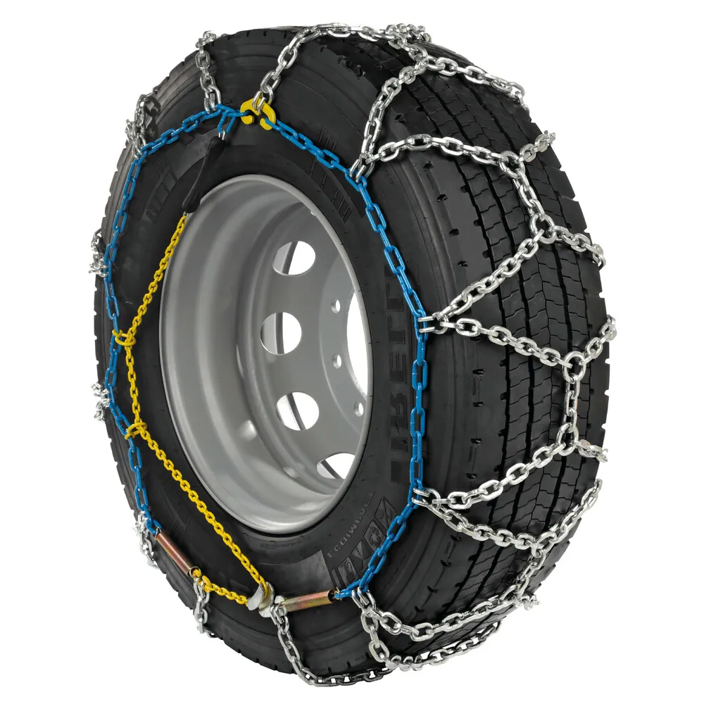 Coppia catene da neve per veicoli commerciali, camion, autobus, omologate onorm v5119 per montaggio e auto-tensionamento rapido, battistrada a rombo in acciaio speciale al manganese, resistente all’usura ed al sale antighiaccio. Disponibili con maglie a sezioni diverse a seconda del mezzo: 12 mm, 16 mm e 25 mm.